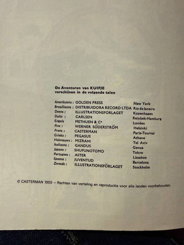 Copyright 1955 D. 1969/0053/243 Blauwe rug 14 talen Vermeldt Leo en Lea bij de Lapino's, dus op zijn vroegst van 1969. De andere druk uit 1969 vermeldt 18 talen, deze slechts 14.